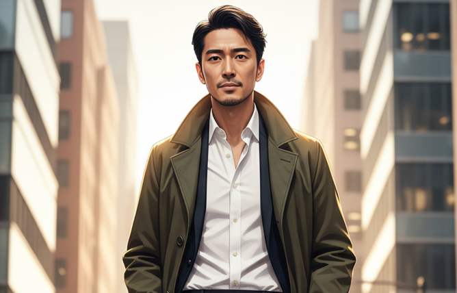 清潔感のあるシャツ、しっかりした生地のパンツ、そして静かに光るコート。